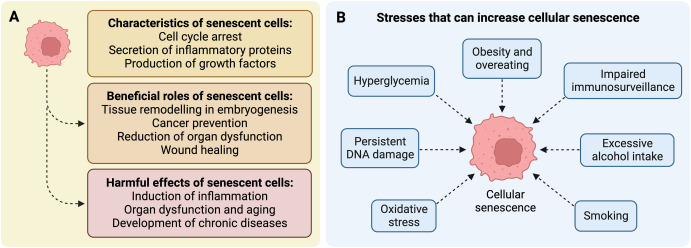Fig. 1. Characteristics of senescent cells and examples of stresses that increase senescence in the human body. (A) Characteristics and roles of senescent cells. (B) Stresses and lifestyle habits that increase the senescence burden.