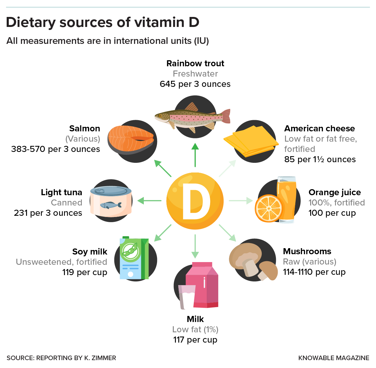 Foods that naturally contain vitamin D, such as fatty fish, egg yolks, red meat, liver and irradiated or sun-dried mushrooms, which are especially rich in vitamin D due to their increased exposure to UV light, can also help. “If you’re out and about and you have sun exposure during some months of the year,” Gallagher says, “you probably get plenty of vitamin D.” That’s especially true if you have enough dairy in your diet.