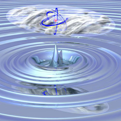 Imaginea sistemului studiat: Un atom Rydberg foarte excitat care constă dintr-un singur electron (culoarea albastră) care se deplasează pe o orbită largă în jurul nucleului încărcat pozitiv (culoarea roşie). Atomul Rydberg are aceeaşi extindere spaţială că a norului atomic ultrarăcit. Mişcarea electronului generează oscilaţii, aşa-numiţii fononi, în gazul cuantic.