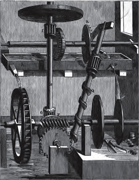 O gravură pe lemn a mașinii perpetuum mobile cu "șurub de apă" a lui Robert Fludd din 1618, creditată în general a fi prima încercare înregistrată de a descrie o asemenea mașinărie cu aplicații practice