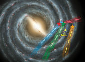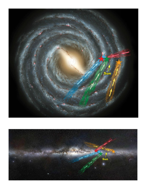 O vedere de sus şi o vedere din lateral a galaxiei Calea Lactee ne arată locaţia a patru stele care fac parte dintr-o nouă clasă de stele hiperrapide. Acestea sunt stele asemănătoare Soarelui care se deplasează cu viteze de peste un milion de mile pe oră în raport cu galaxia: o viteză suficient de mare pentru ca acestea să poată scăpa de atracţia gravitaţională a galaxiei. Direcţiile din care au venit stelele sunt afişate prin benzi colorate.