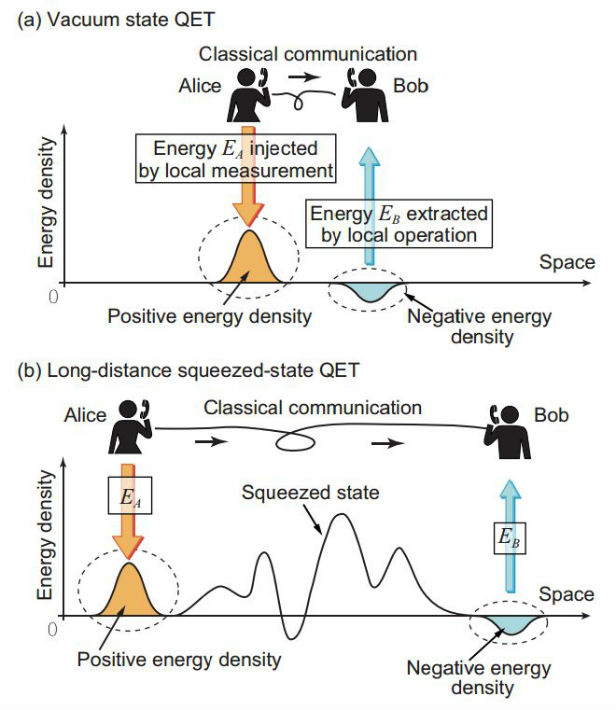 O diagramă schematică pentru (a) protocolul de teleportarea a energiei cuantice într-o stare de vid (QET) ţi (b) transferul pe o distanţă mare a unei stări cuantice fără zgomot.