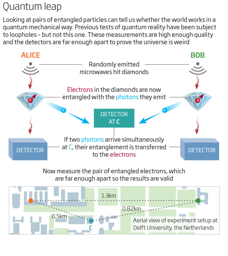 Multiple echipe de cercetători s-au întrecut în a realiza acest tip de experiment în ultimele decade. Iar echipa condusă de Ronald Hanson, Universitatea Delft de Tehnologie din Olanda, a reuşit.