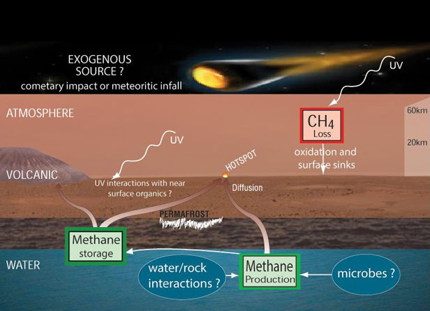 Dacă atmosfera lui Marte conţine metan, diverse posibilităţi pentru originea acestuia au fost propuse şi cum ar fi putut acesta dispărea. Surse posibile non-biologice pentru metan includ comete, degradarea particulelor interplanetare de praf sub acţiunea luminii ultraviolete şi interacţiunea dintre apă şi roci. O potenţială sursă biologică ar fi microbii, dacă microbii au existat vreodată pe Marte. Potenţialele cauze de eliminare a metanului din atmosferă sunt fotochimia din atmosferă şi pierderea metanului la suprafaţă.