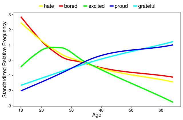 Cuvintele folosite variază şi în funcţie de vârstă. Cu cât eşti mai tânăr, cu atât eşti mai predispus să spui lucruri precum "ură" şi "plictisit" şi cu cât eşti mai bătrân, cu atât eşti mai predispus să spui "mândru" şi "recunoscător".