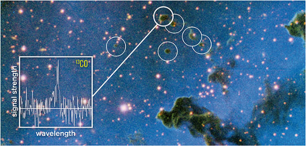 Astronomii au constatat că norii întunecaţi de mici dimensiuni, rotunzi, numiţi globule, au caracteristicile necesare pentru formarea planetelor care plutesc libere în spaţiu. Graficul din imagine arată spectrul unei astfel de globule noroase obţinut cu ajutorul telescopului de 20 de metri din cadrul Onsala Space Observatory. Undele radio provenite din moleculele de monoxid de carbon (13CO) oferă informaţii despre masa şi compoziţia acestor nori.