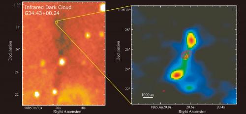 O echipă internațională de cercetători condusă de Takeshi Sakai de la Universitatea de Electro-Comunicații din Japonia a observat norul interstelar întunecat G34.43+00.24 MM3 din constelația Aquila (Vulturul) cu ALMA (Atacama Large Milimeter Array) și a descoperit o stea în formare înconjurată de un nor cald de dimensiuni mari.