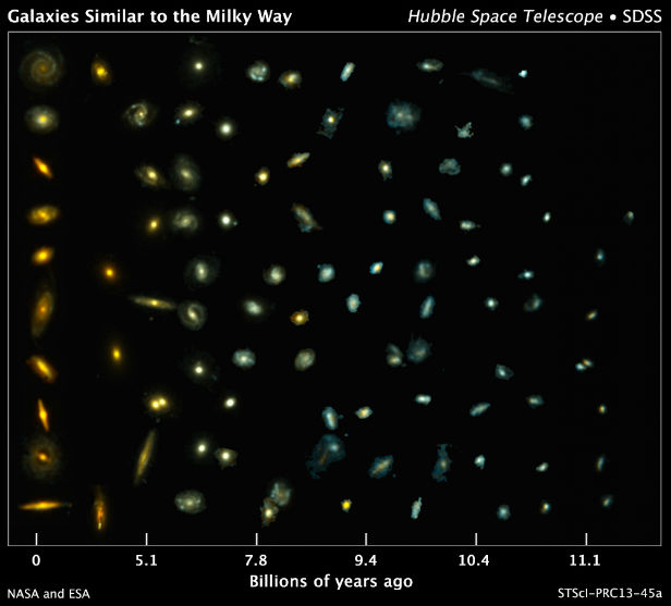 Această imagine compozită ne prezintă exemple de galaxii similare cu Calea Lactee aflate în diferite faze de evoluţie de-a lungul unei perioade de 11 miliarde de ani. Galaxiile sunt aranjate în funcţie de timp. Cele din partea stângă se află în apropierea noastră iar cele din dreapta se întind până la o distanţă corespunzătoare unei perioade în care Universul avea o vârstă de aproximativ 2 miliarde de ani. Strălucirea albăstruie a stelelor tinere predomină în culoarea galaxiilor din partea dreaptă a imaginii. Galaxiile din partea stângă sunt mai roşii datorită prezenţei în cadrul lor a stelelor bătrâne. Astronomii au descoperit galaxiile îndepărtate cu ajutorul telescopului spaţial Hubble care a fost utilizat în două programe de observaţii astronomice denumite 3D-HST şi Cosmic Assembly Near-infrared Deep Extragalactic Legacy Survey sau CANDELS. Observaţiile au fost făcute în lumină vizibilă şi în infraroşu apropiat cu ajutorul Wide Field Camera 3 şi a Advanced Camera for Surveys ale telescopului Hubble. Imaginile galaxiilor din apropiere au fost obţinute de către Sloan Digital Sky Survey. Această imagine arată galaxii similare Căii Lactee de-a lungul istoriei lor cosmice, dezvăluind modul în care acestea au evoluat în timp. Imaginile deosebit de fidele ale telescopului spaţial Hubble au permis înţelegerea formelor pe care le au galaxiile arătând că bulbul galactic şi discul galactic s-au dezvoltat simultan.