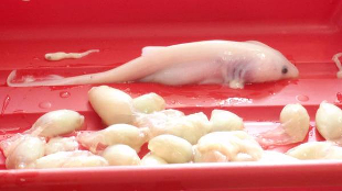 Embrionul mai mic al unui rechin de nisip (stânga) a fost recuperat din gâtlejul unuia mai mare.