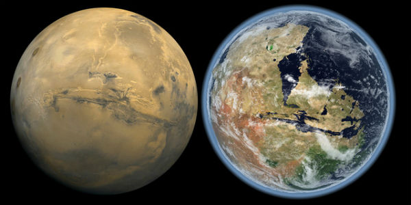 Două imagini ale planetei Marte, din prezent şi cu câteva miliarde de ani în urmă.