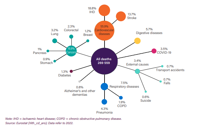 Bolile cardiovasculare reprezintă principala cauză de deces și dizabilitate în România, fiind responsabile pentru peste jumătate din totalul deceselor și afectând milioane de persoane în fiecare an. Sursa foto – Eurostat