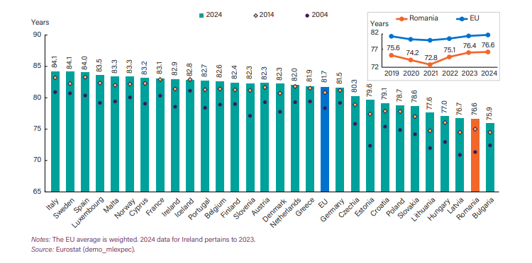 După scăderea abruptă înregistrată în perioada pandemiei de COVID-19, speranța de viață la naștere în România a început să crească din nou începând cu 2022, atingând 76,6 ani în 2024, cel mai ridicat nivel din istorie. Cu toate acestea, diferența față de media Uniunii Europene rămâne de 5,1 ani.