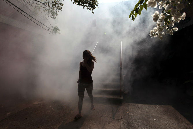 Femeie care se depărtează de casă, în timp ce se efectuează operaţiuni preventive împotriva ţânţarilor, folosind fumul (El Salvador)