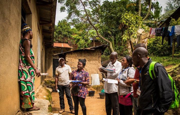 Reprezentanți ai comunității vin să viziteze o familie din periferia Beni pentru a informa despre Ebola