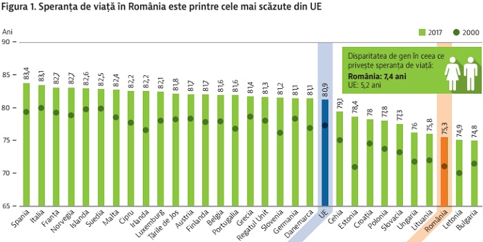 Speranța de viață a crescut de la 71,2 ani (anul 2000) la 75,3 ani (2017), dar plasează România pe locul trei de la coadă, înaintea Bulgariei și Letoniei. Pe de altă parte, România are cea mai ridicată rată de cazuri de tuberculoză din UE.