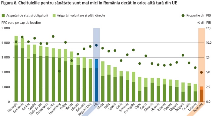 Cheltuielile pentru sănătate sunt cele mai scăzute din UE, atât pe cap de locuitor (1.029 EUR vs 2.884 EUR - media UE), cât și ca procent din PIB (5% vs 9,8% - media UE).
