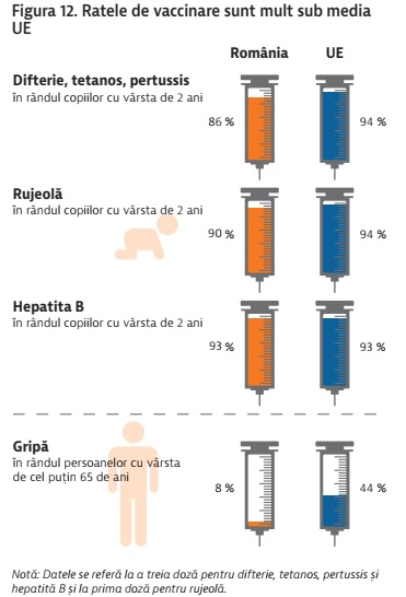 Ratele de imunizare a copiilor sunt printre cele mai scăzute din UE, mai multe epidemii de rujeolă fiind înregistrate în ultimii ani.