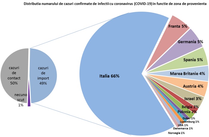 2. Din cele 261 de cazuri confirmate la 13 martie, 127 au fost înregistrate la persoane care au revenit în România din străinătate. În 66% din cazuri țara de proveniență a fost Italia.