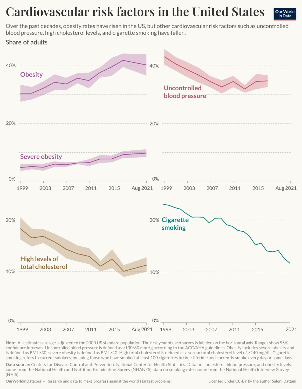 În graficul de mai jos, sunt prezentate câțiva dintre cei mai importanți factori de risc ai bolilor cardiovasculare: obezitatea, tensiunea arterială necontrolată, colesterolul ridicat și fumatul. Datele pentru toți cei patru factori de risc sunt disponibile din sondaje naționale începând cu 1999, astfel că analiza se concentrează pe ultimele decenii.