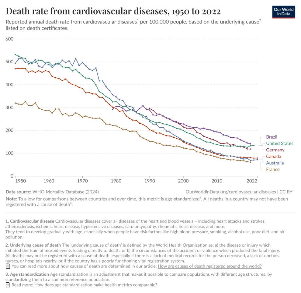 Doar în Statele Unite, rata deceselor standardizată pe vârstă cauzate de boli cardiovasculare a scăzut cu trei sferturi din 1950 încoace. Asta înseamnă că, pentru persoane de aceeași vârstă, riscul anual de a muri din cauza unei boli cardiovasculare este acum de doar un sfert față de cel din 1950.
