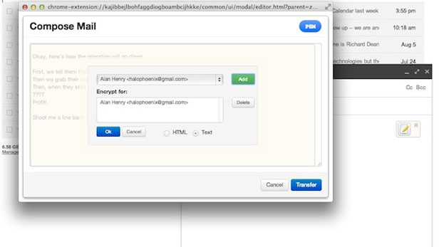 Data viitoare când veţi deschide Gmail şi veţi dori să scrieţi un e-mail, veţi vedea un mic buton "Notepad" care va plana peste zona compunerii mesajului. Daţi clic pe el pentru a activa ecranul Mailvelope de compunere mesaje. Scrieţi ce doriţi în acea fereastră şi apoi daţi din nou clic pe butonul Notepad. Selectaţi perechea de chei pe care doriţi să o folosiţi pentru a cripta mesajul şi daţi OK, după care veţi vedea mesajul în forma sa criptată. Daţi clic pe ”Transfer” pentru a retrimite mesajul în Gmail (şi atunci va fi de fapt prima dată când mesajul va fi realmente în Gmail – pentru că în timp ce compuneţi textul în Mailvelope, nu se stochează nicio ciornă şi textul nu poate fi văzut de Google) după care trimiteţi mesajul la destinaţie.