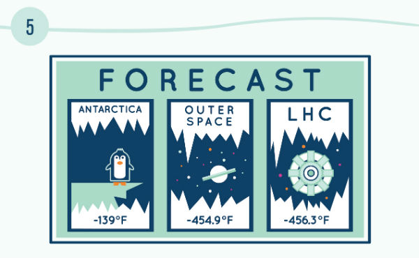 Pentru a conduce electricitatea fără rezistenţă, electromagneţii de la Large Hadron Collider - LHC - sunt răciţi până la temperaturi criogenice. Sistemul criogenic de la LHC este cel mai mare din lume şi funcţionează la minus 456,3 grade Fahrenheit (minus 271,3 grade Celsius). Este unul dintre cele mai reci locuri de pe Pământ şi este chiar cu câteva grade mai rece decât spaţiul interstelar, care tinde să se situeze în jurul a minus 454,9 grade Fahrenheit (minus 270,5 grade Celsius).