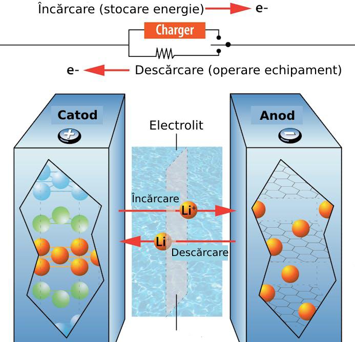 Atunci când dispozitivul/ echipamentul consumă energia bateriei, ionii de la electronul negativ se mută către cel pozitiv, având, în fapt, un curent electric care asigură funcționarea telefonului ori a mașinii electrice.