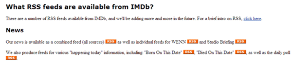 Astăzi, toate site-urile care ţin la reputaţia lor, au un buton de RSS, uşor de identificat. Unele au chiar un feed diferit pentru diferite tipuri de informaţii. Spre exemplu, mai jos este butonul de RSS Feed al site-ului IMDB.
