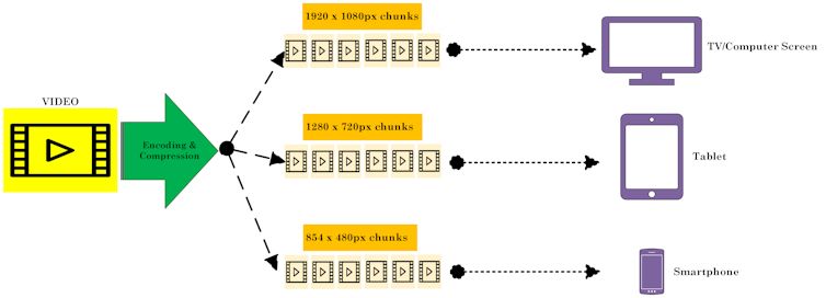 Pentru a aborda aceste provocări, furnizorii de conținut video implementează o serie de optimizări. Primul pas constă în fragmentarea videoclipurilor în bucăți mai mici, numite frecvent „chunk-uri” (bucăți). Acestea trec apoi printr-un proces numit „codare și compresie”, care optimizează videoclipul pentru diverse rezoluții și rate de biți, astfel încât să se potrivească diferitelor tipuri de dispozitive și condiții de rețea.