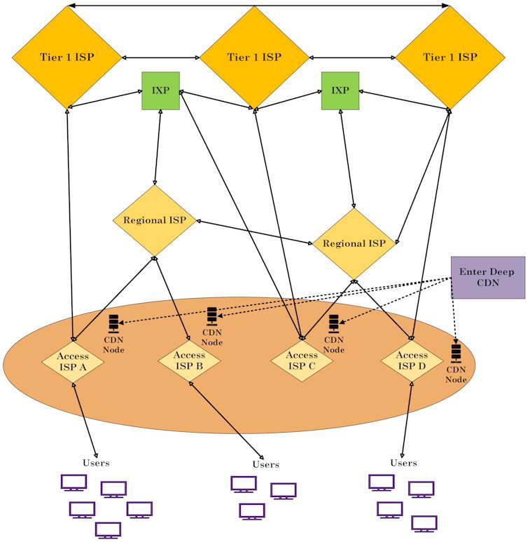 Această diagramă, cu infrastructura principală a Internetului (backbone) în partea de sus și utilizatorii în partea de jos, ilustrează abordarea „Enter Deep”, care constă în amplasarea serverelor de livrare a conținutului „în adâncul” rețelei, cât mai aproape de utilizatori.