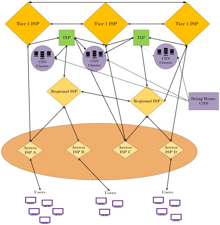 Această diagramă, cu infrastructura principală a Internetului (backbone) în partea de sus și utilizatorii în partea de jos, ilustrează abordarea „Bring Home”, care constă în amplasarea serverelor de livrare a conținutului între infrastructura principală și furnizorii regionali de servicii de Internet.