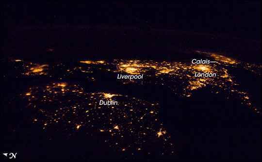Privind spre est dintr-o poziţie din sud-vestul Irlandei, un astronaut a avut această panoramă pe timp de noapte a centrelor de populaţie din Irlanda şi Marea Britanie. Imaginea a fost făcută pe 1 februarie 2008, folosind lentile de 28 mm.