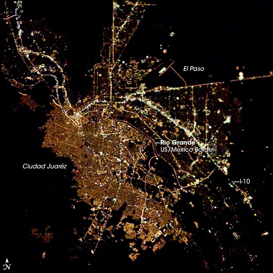 Oraşele de frontieră precum Ciudad Juaréz, Mexico, şi El Paso, Texas, ilustrează diferitele modele de oraşe „margină-lângă-margină”, sugerând influenţe culturale cu privire la dezvoltarea şi creşterea oraşelor şi a infrastructurii. Ciudad Juaréz suportă cel puţin 1,300,000 de oameni. Pe partea americană a Rio Grande, El Paso este iluminat de Autostrada Interstatală I-10 ce traversează oraşul. Deşi zona El Paso, cu o populaţie estimată la ceva mai mult de 600,000 este în zona de construcţie a oraşului Ciudad Juaréz, densitatea aşezărilor evidenţiată de distribuţia luminilor, este mult mai mică.