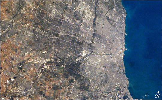 Chicago, Illinois, este oraşul unde locuiesc aproximativ trei milioane de oameni, dar zona metropolitană mai largă include aproape zece milioane. Pe timpul zilei (fotografia de sus), centrul oraşului de culoarea cimentului se amestecă aproape imperceptibil în culorile gri-verzi ale suburbiilor şi apoi ale terenurilor agricole. Pe timpul nopţii (următoarea fotografie), regiunea a zece milioane de oameni nu poate fi uitată. Prima fotografie este făcută pe data de 8 octombrie 2003, cu lentile de 50 mm. A doua fotografie a fost făcută pe 7 octombrie 2003, cu lentile de 50 mm.