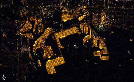 Luminile cu vapori portocalii de sodiu iluminează instalaţiile portuare de la Long Beach, California, sprijinind operaţiunile non-stop dintr-unul din cele mai aglomerate porturi comerciale de marfă. Imaginea a fost făcută la data de 4 februarie 2008, fiind folosite lentile de 400 mm, care au furnizat o rezoluţie superioară.
