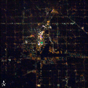 „Fâşia Vegas”de cazinouri şi hotele - cu reputaţia de a fi cel mai luminos punct de pe Pământ - iese în evidenţă în centrul acestei imagini atât din cauza strălucirii, cât şi din cauza diversităţii de culori. Imaginea a fost făcută pe data de 4 februarie 2008, folosind lentile de 400 mm.