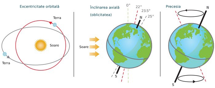 Oblicitatea: înclinarea axei Pământului variază între 22o şi 25o într-o perioadă de 41.000 de ani.