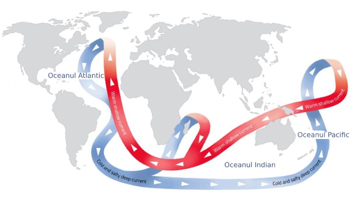 Circulaţia termohalină a oceanelor. În albastru sunt reprezentaţi curenţii de apă adâncă, iar în roşu cei de suprafaţă.