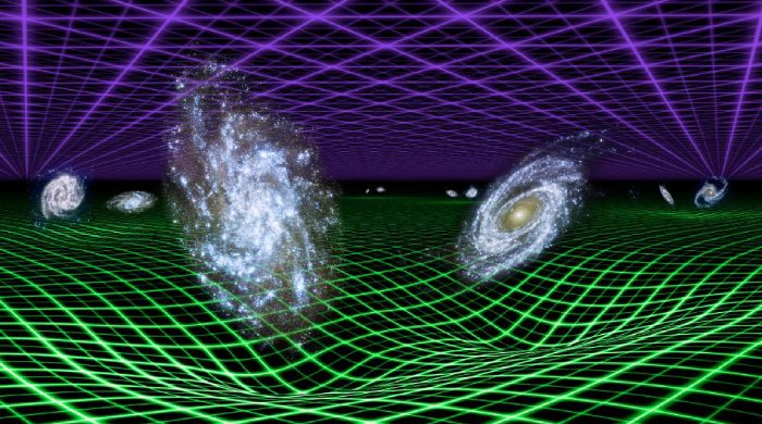Cosmologii cred că expansiunea universului este reglată atât de forţa gravitaţională, cât şi de misterioasa energie întunecată, care acţionează în sens contrar celei gravitaţionale. În imaginea de mai sus (credit: NASA) energia întunecată este reprezentată de grila mov de deasupra, iar gravitaţia de grila verde de jos. Gravitaţia este generată de toată materia din univers, dar efectele sale sunt localizate, dat fiind faptul că scade rapid odată cu distanţa.