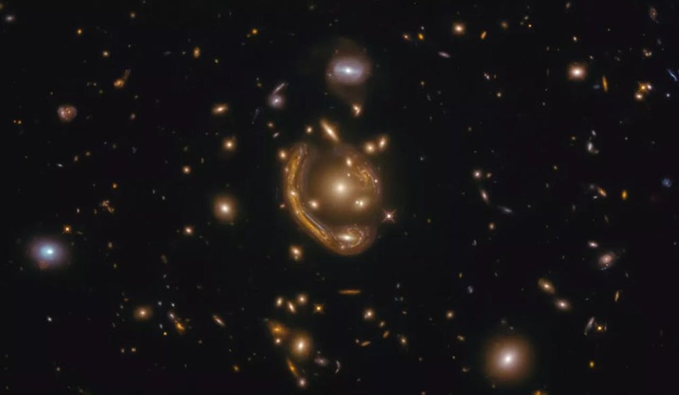 Telescopul Hubble a captat o lentilă gravitațională numită GAL-CLUS-022058s. Aici un roi de galaxii curbează imaginea unei galaxii de fundal, oferindu-ne o vedere a acestei galaxii, așa cum arăta acum 9 miliarde de ani. Credit: ESA/Hubble & NASA, S. Jha Acknowledgement: L. Shatz, CC BY