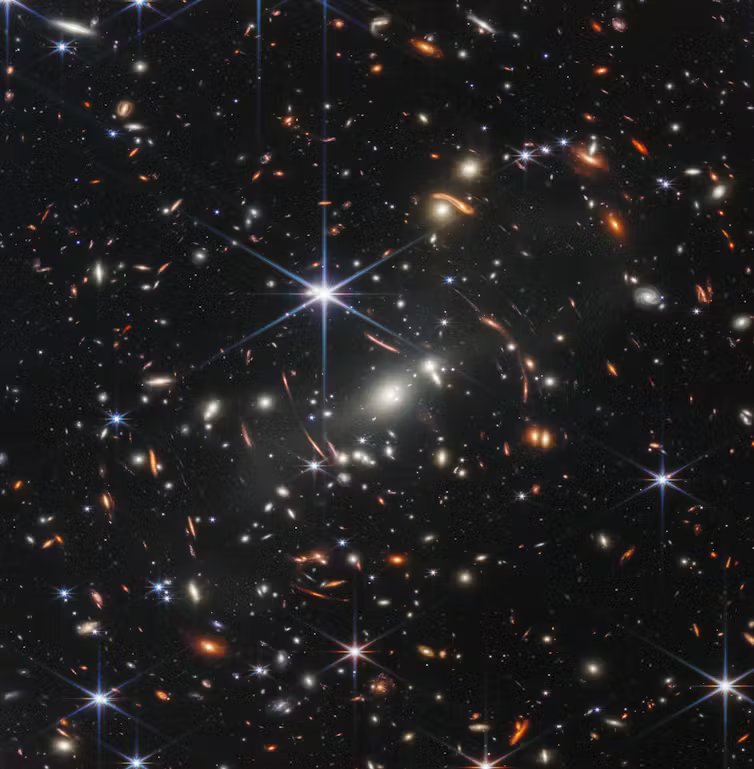 Una dintre primele imagini făcute publice de Telescopul James Webb, roiul de galaxii denumit SMACS J0723.3−7327 fiind lentilă gravitațională pentru multe galaxii depărtate din spatele acestuia. Credit: NASA, ESA, CSA, and STScI